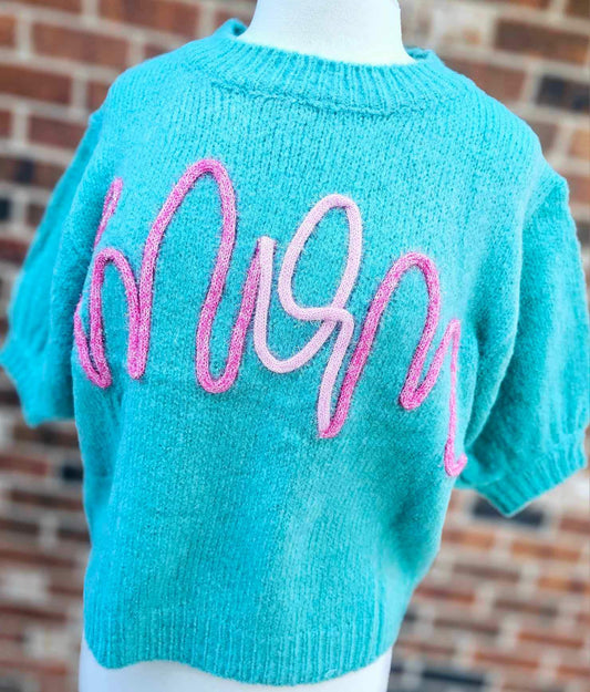 MOM Metallic Tinsel Short Puff Sleeve Top - TEAL