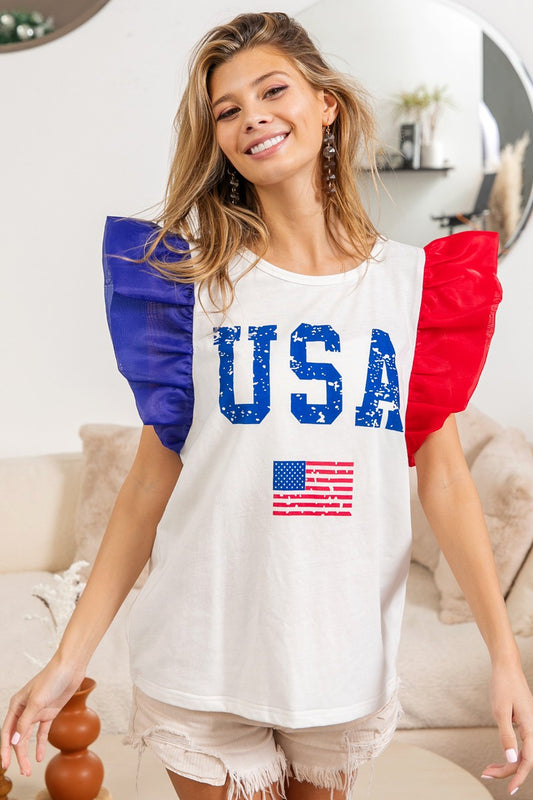 Patriot- Sleeveless knit top with sequin flag patch