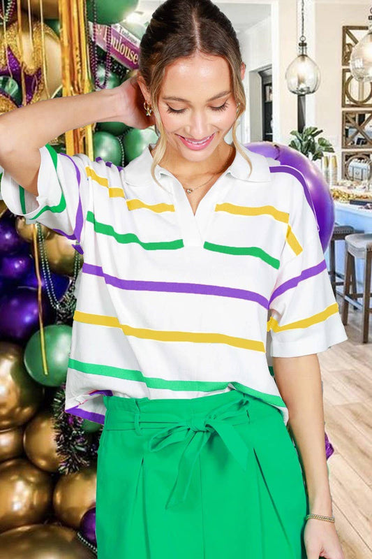 ELKS- Multi Stripe Short-Sleeve Collared V-Neck