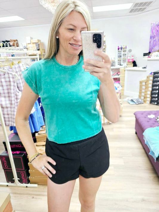 Garment Washed COTTON CROP- FOLDED SLEEVE TOP