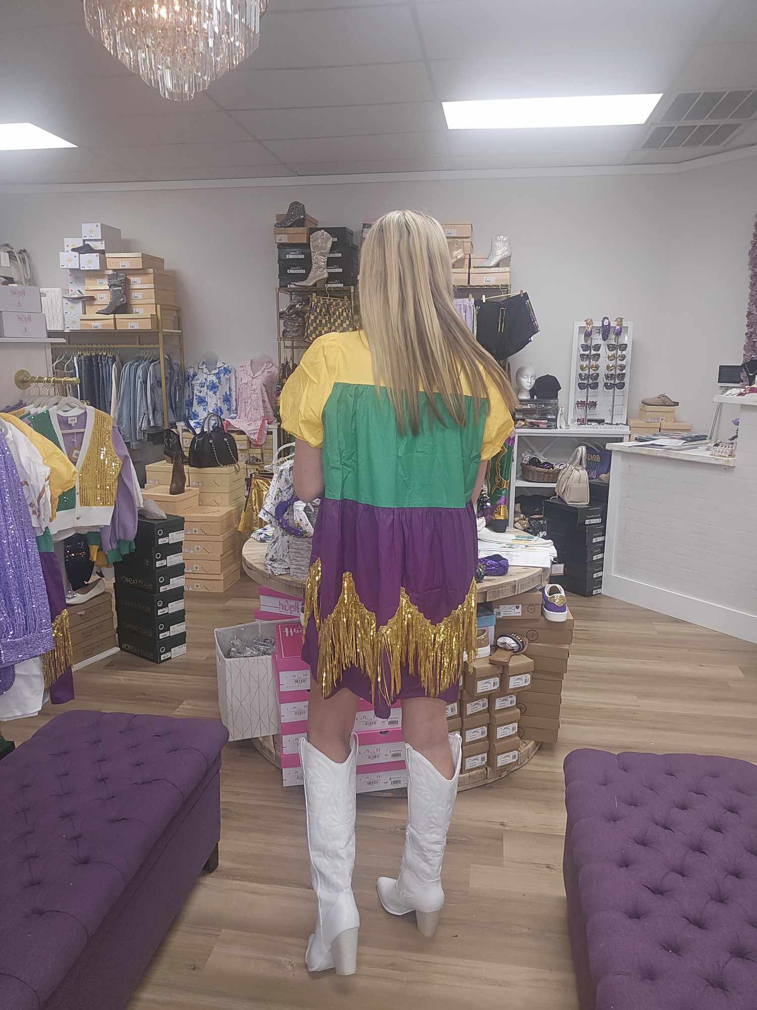 Color Block Mardi Gras Dress With Foil Fringe - Front button down closure - Collared - Short puff sleeves - Color block tiers - Zig-zag foil fringe