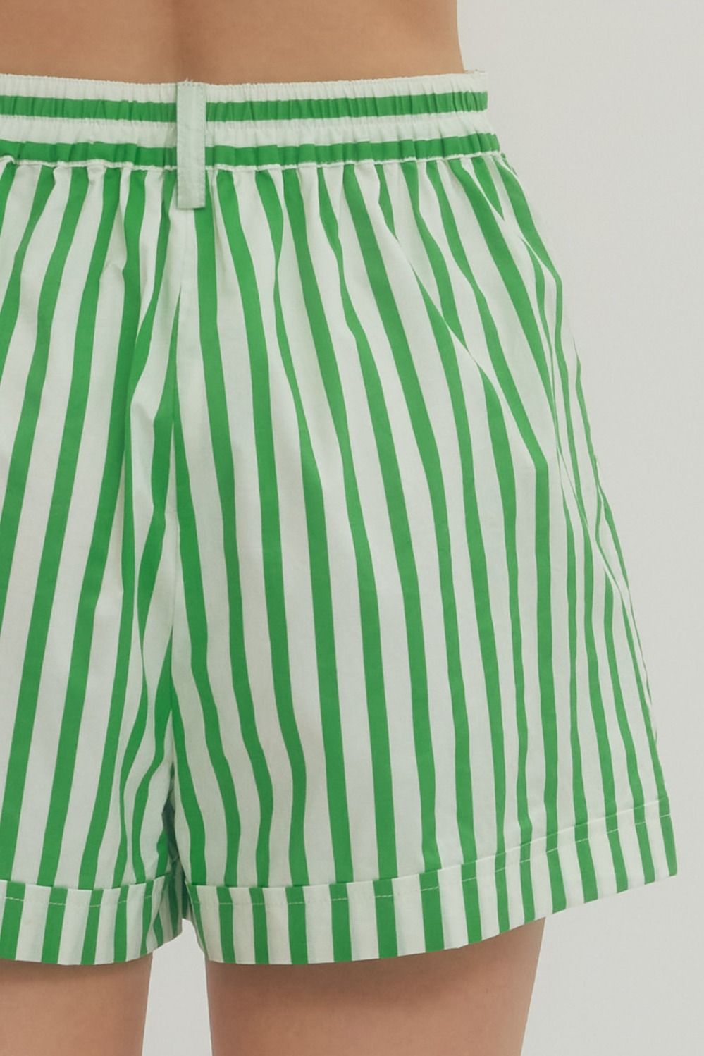 Stripe print woven shorts featuring elasticated waistband at back. Button closure at front. Side pockets. Lined. Woven. Non-sheer. Lightweight.