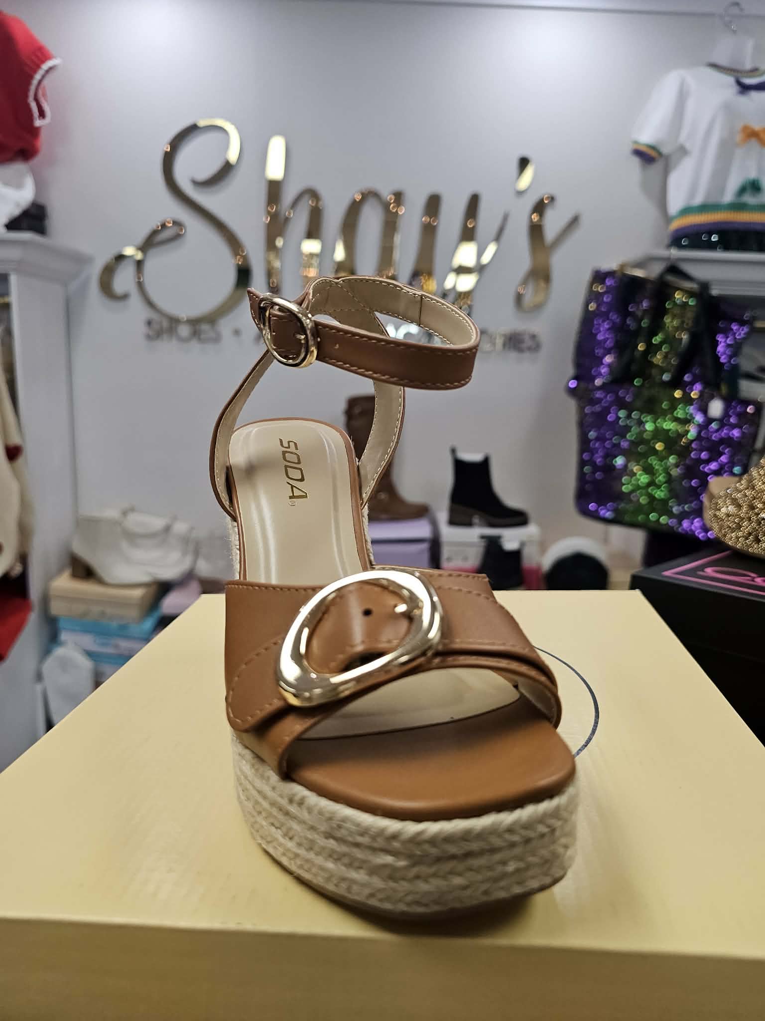 Elevate your everyday style with the HEST Wedges—where sophistication meets fun. These platform wedges feature a sleek silhouette that works with virtually any outfit, from casual jeans to dressed-up ensembles. The secure ankle strap keeps you comfortable and confident all day long, while shimmering gold accents add just the right touch of glamour. Whether you're heading to brunch or a night out, these trendy wedges deliver that effortless, polished look that never goes out of style.