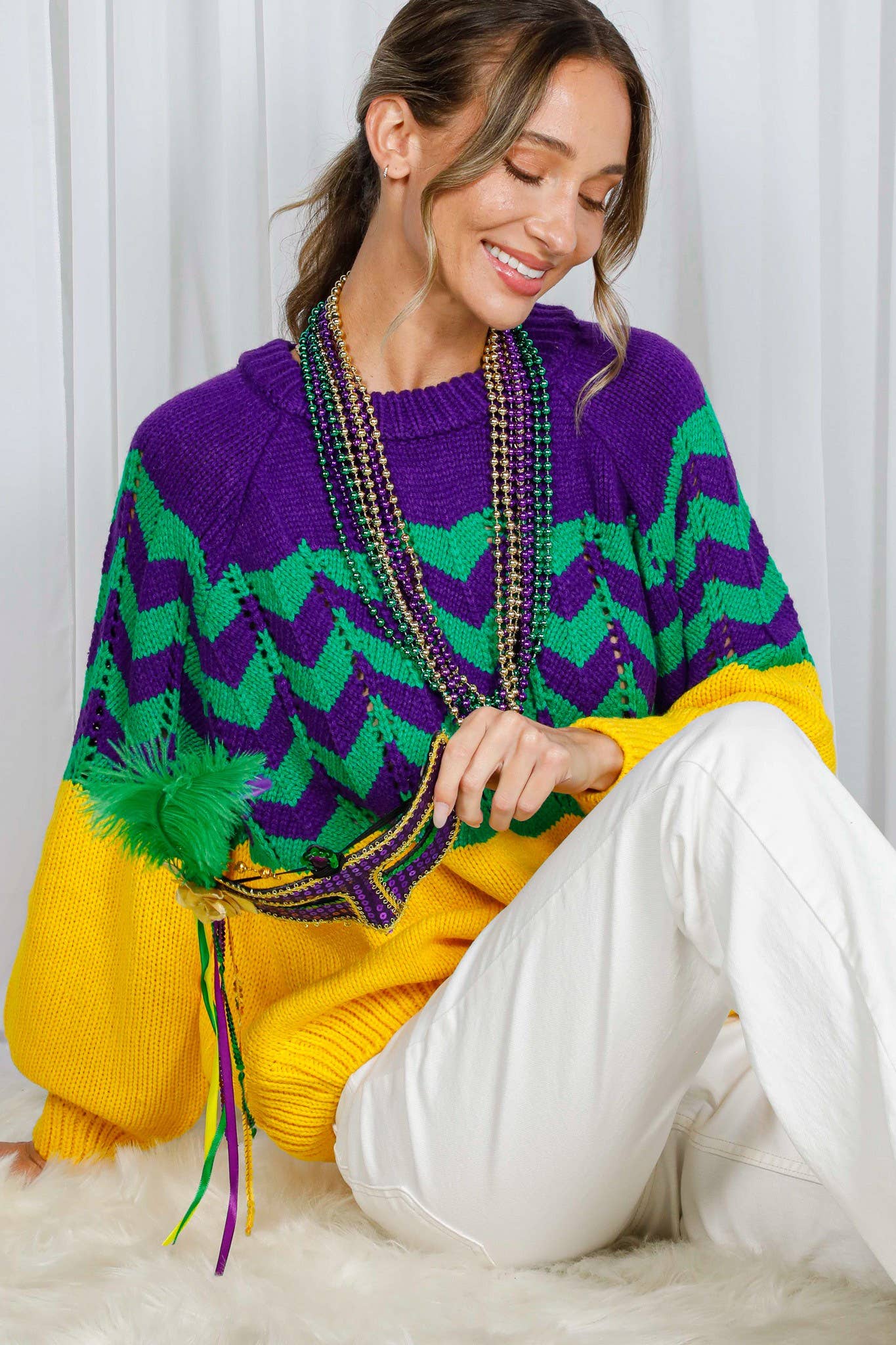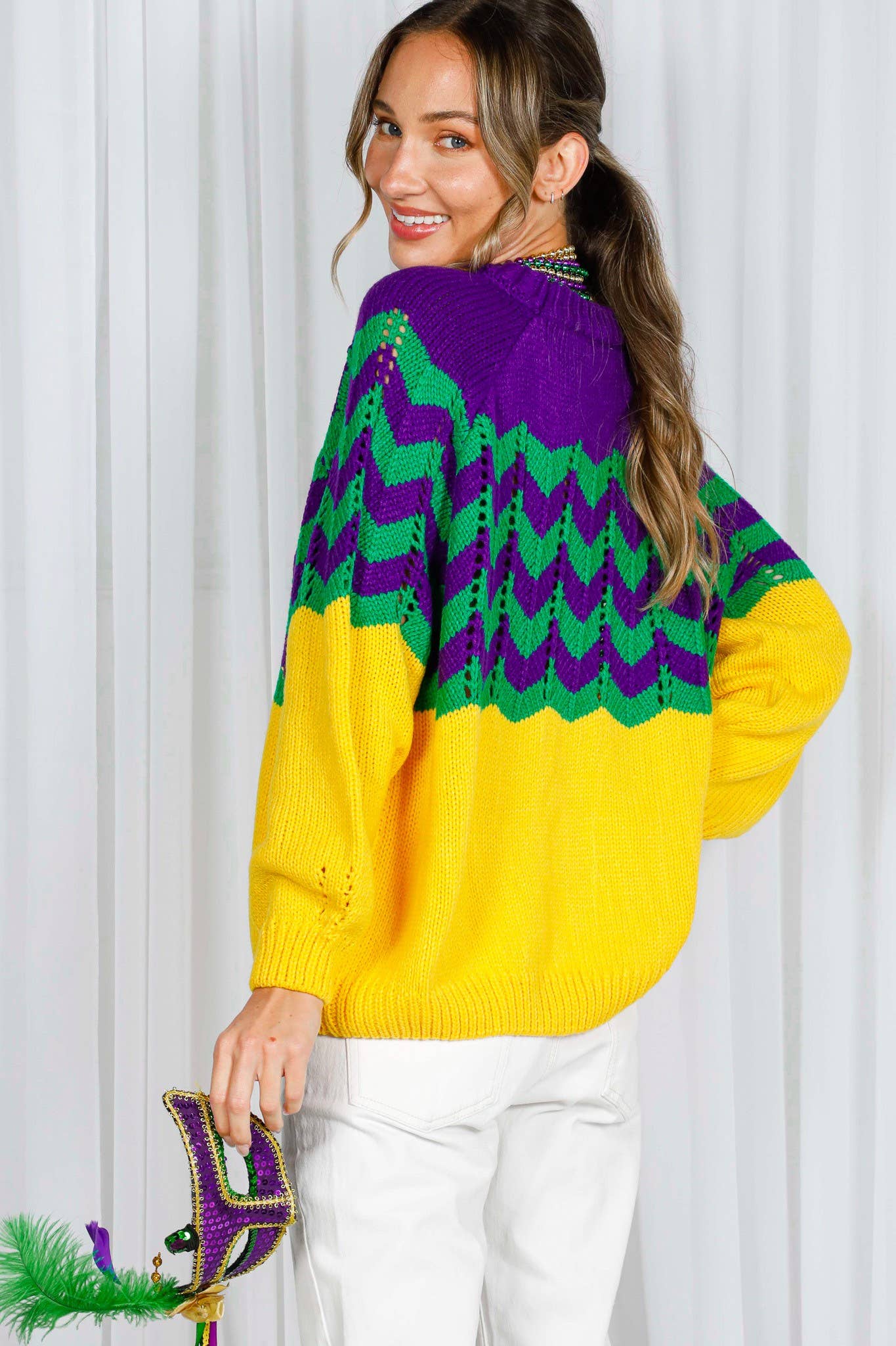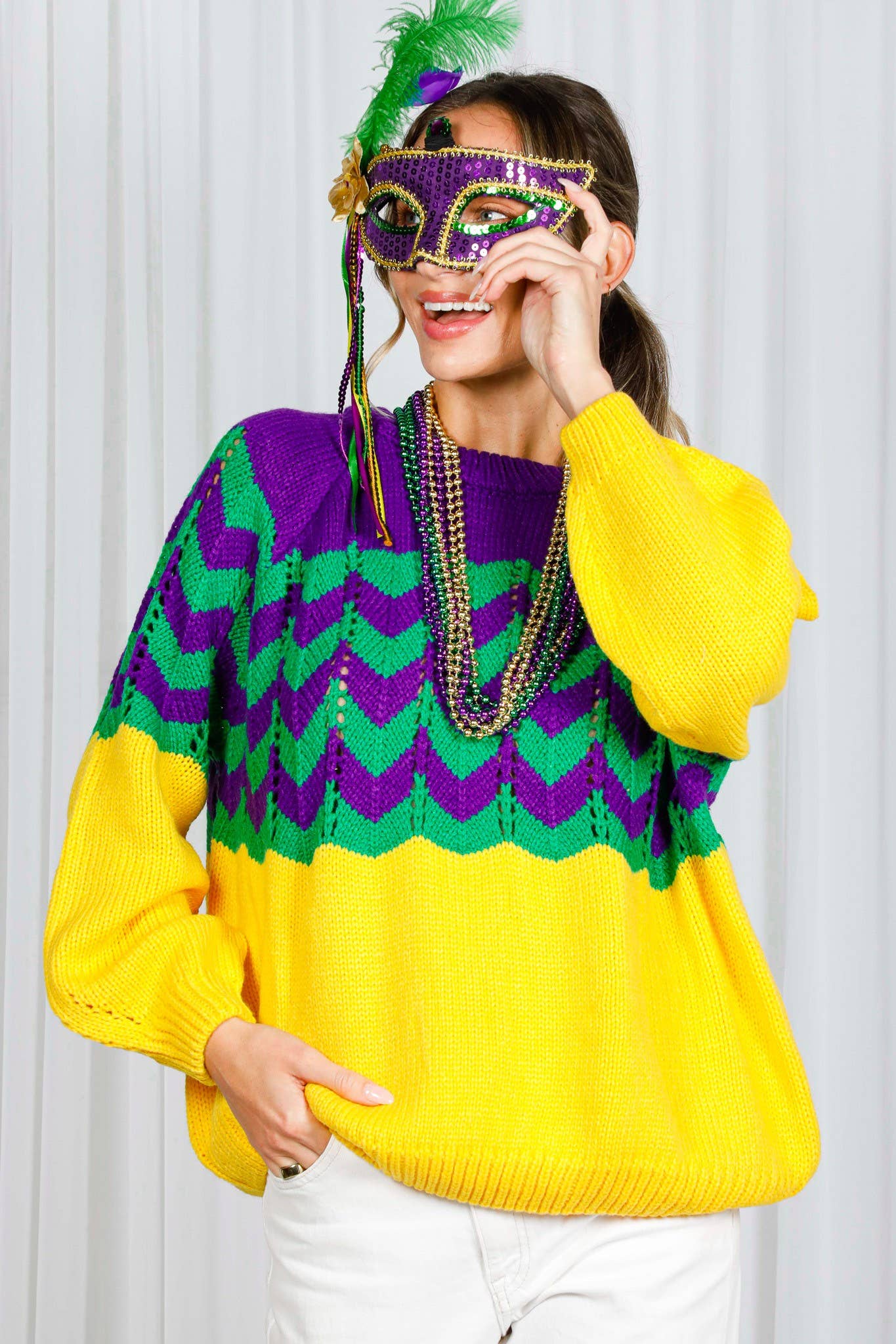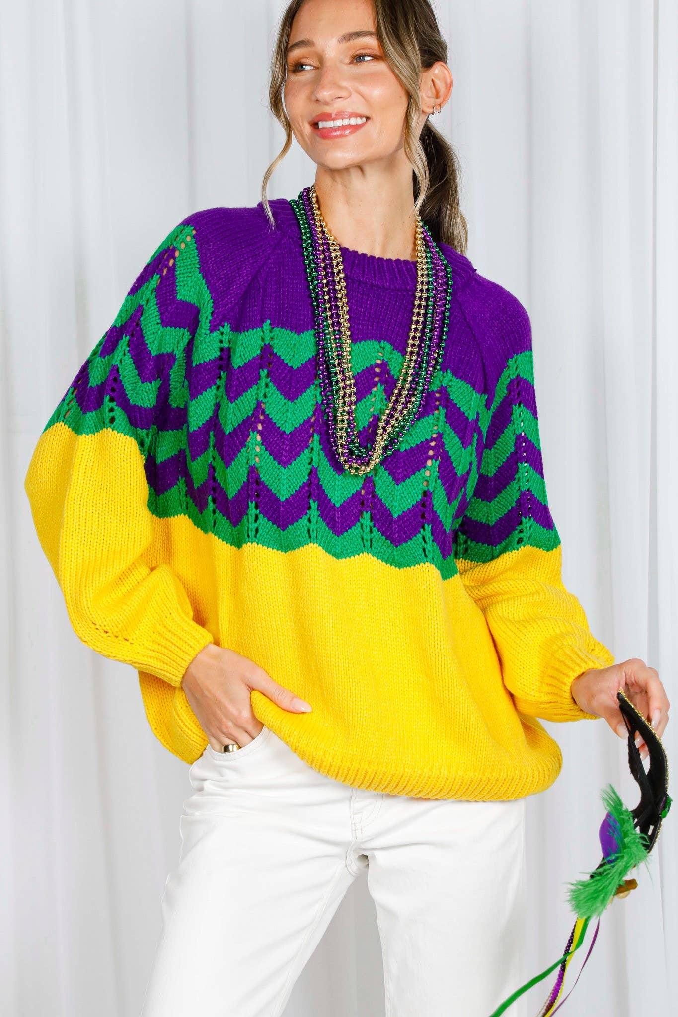 - Ribbed crew neckline - Fair Isle Pattern - Wavy striped crochet knitted sweater - Raglan long-sleeve ribbed hem - Comfortable, relaxed fit - Soft touch - Pullover style - Excellent stretch - Mardi Gras Item - Cozy and fun, this sweater brings playful glamour to your wardrobe while keeping you comfortable for all the festivities ahead - Holiday, Winter, Outdoor, Daily, Going out * * Model is 5'8, 32-27-37, wearing SMALL