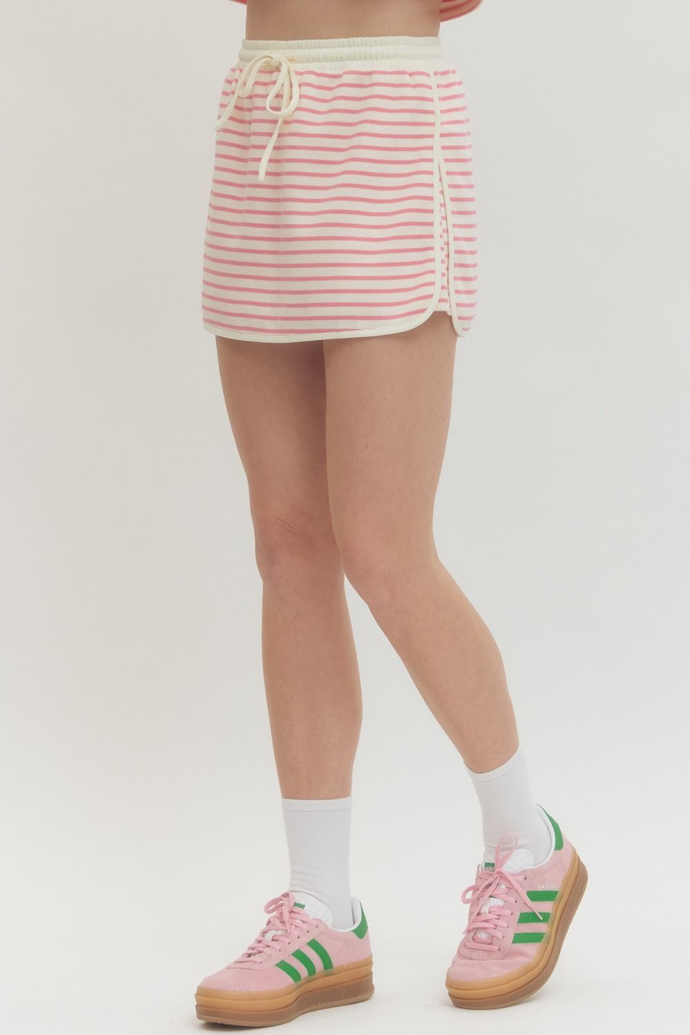 Striped knit skort featuring elasticated waistband with drawstring detail and contrast piping. Unlined. Knit. Non-sheer. Lightweight.