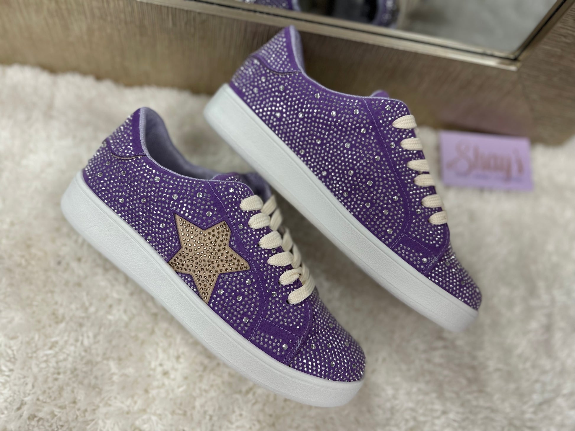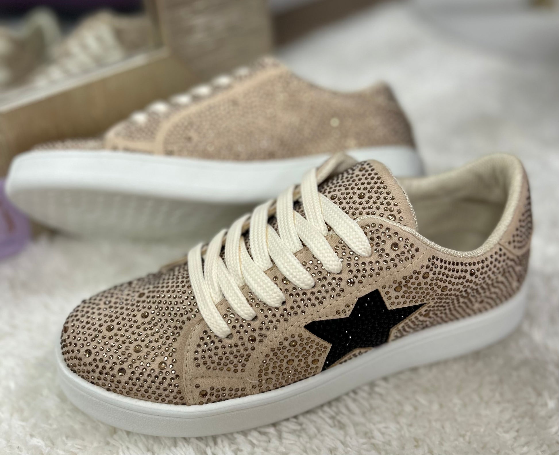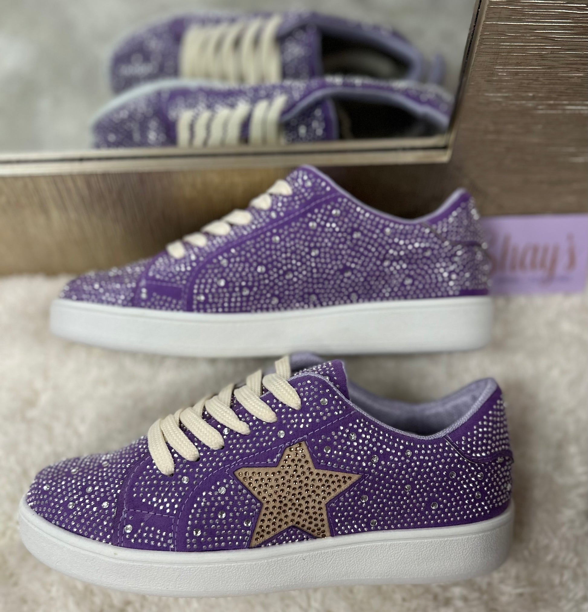Introducing Miel Tennis - the ultimate game day shoe! Whether you're cheering on your favorite team or just want to make a statement, these sparkling rhinestone tennis shoes have got you covered. Stay stylish and comfortable with the trendy rhinestone star detail. Perfect for any game day or to add a pop of sparkle to your day to day wardrobe! They’re must haves in both colors options.