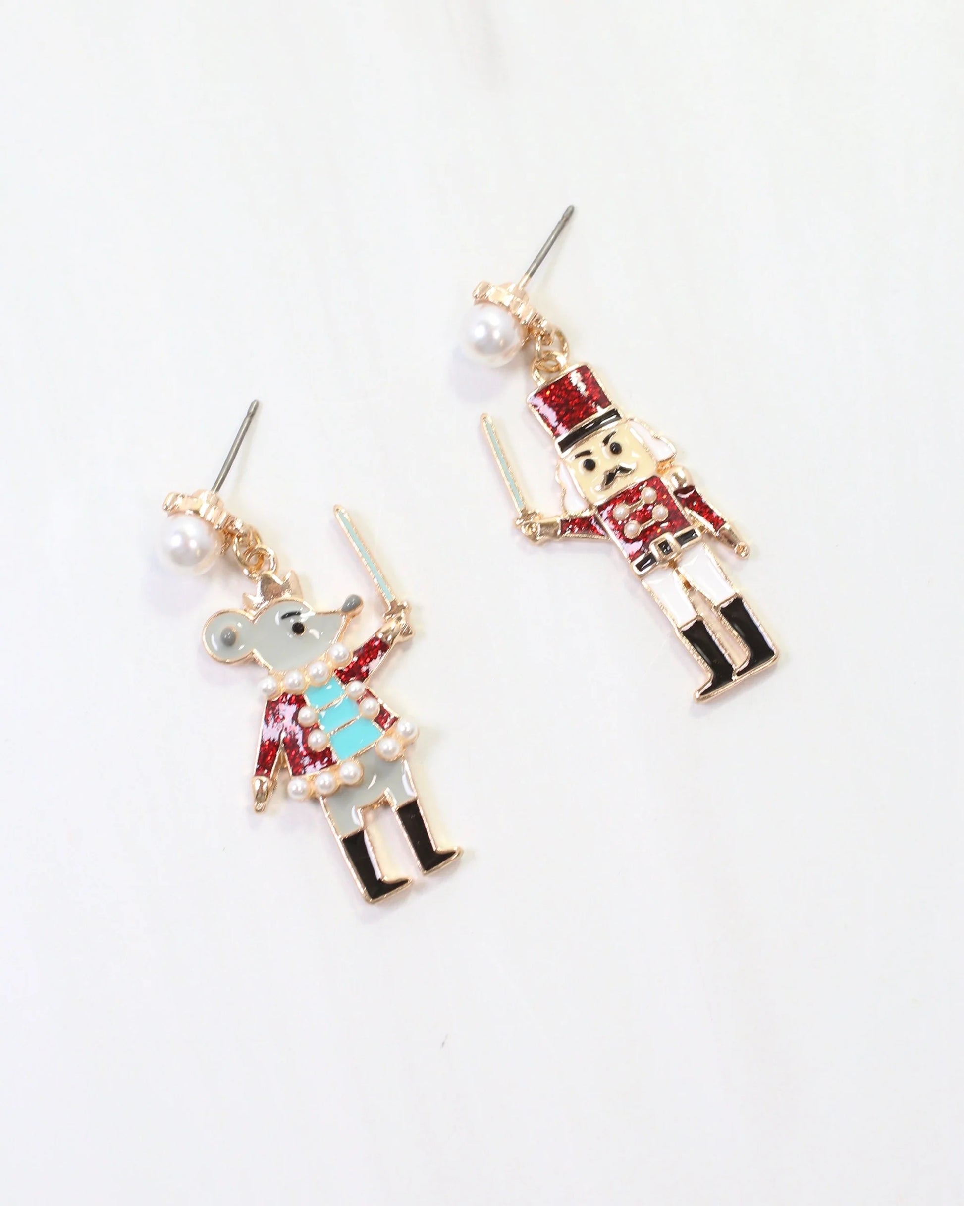 The Mouse King and Nutcracker Earrings in red feature glittered enamel coats on detailed enamel studs, accented with gold and pearls. These noble-inspired earrings add a stylish and refined touch to your holiday collection.