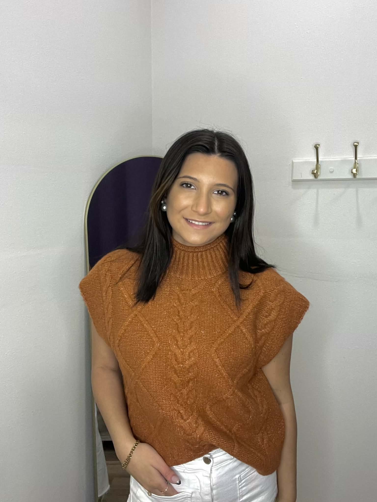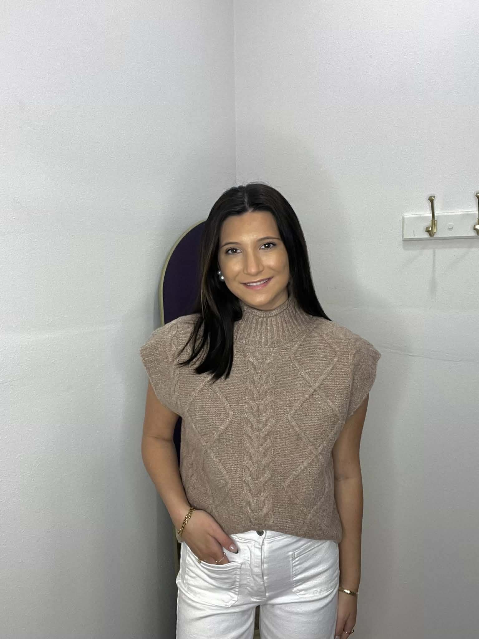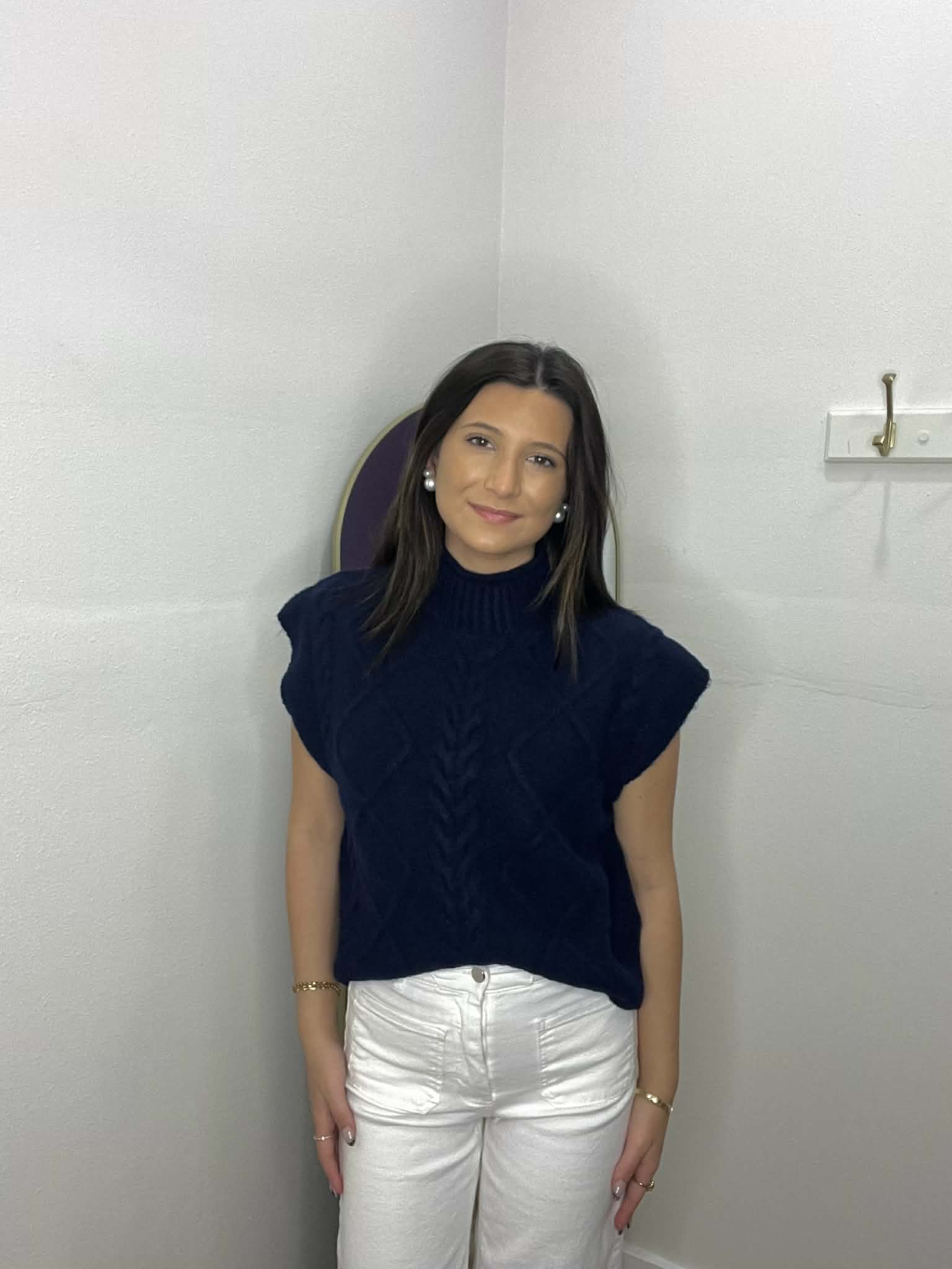 Solid cap sleeve mock neck sweater knit top featuring cable knit pattern. Unlined. Knit. Non-sheer. Medium weight.