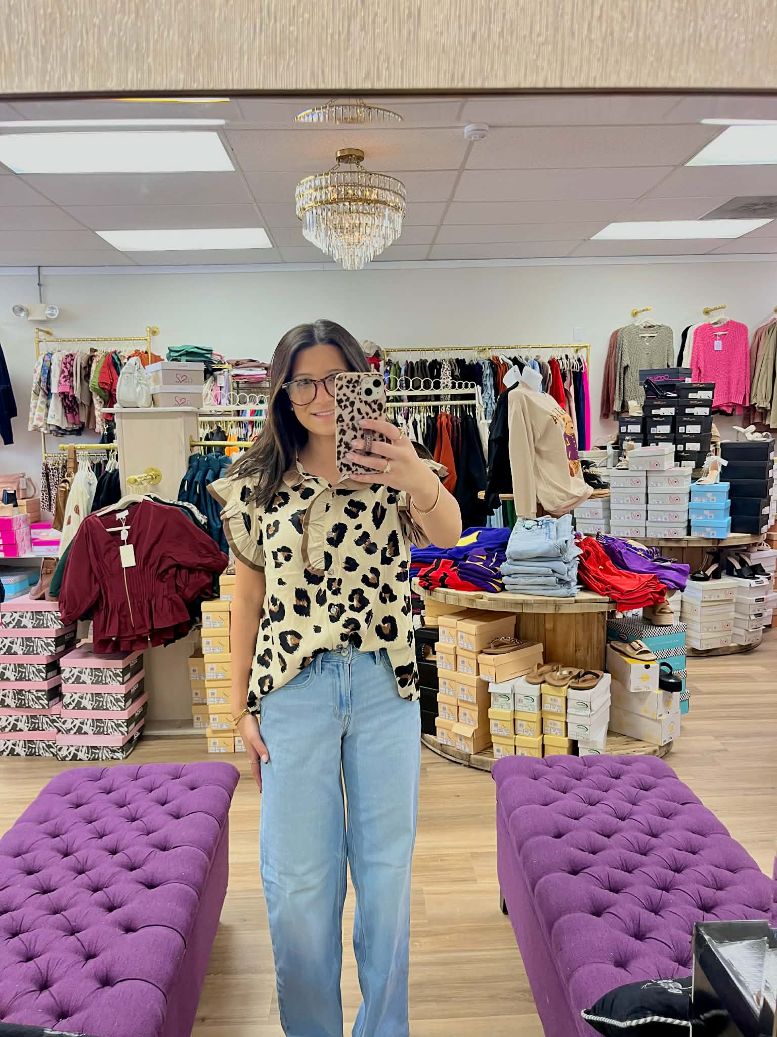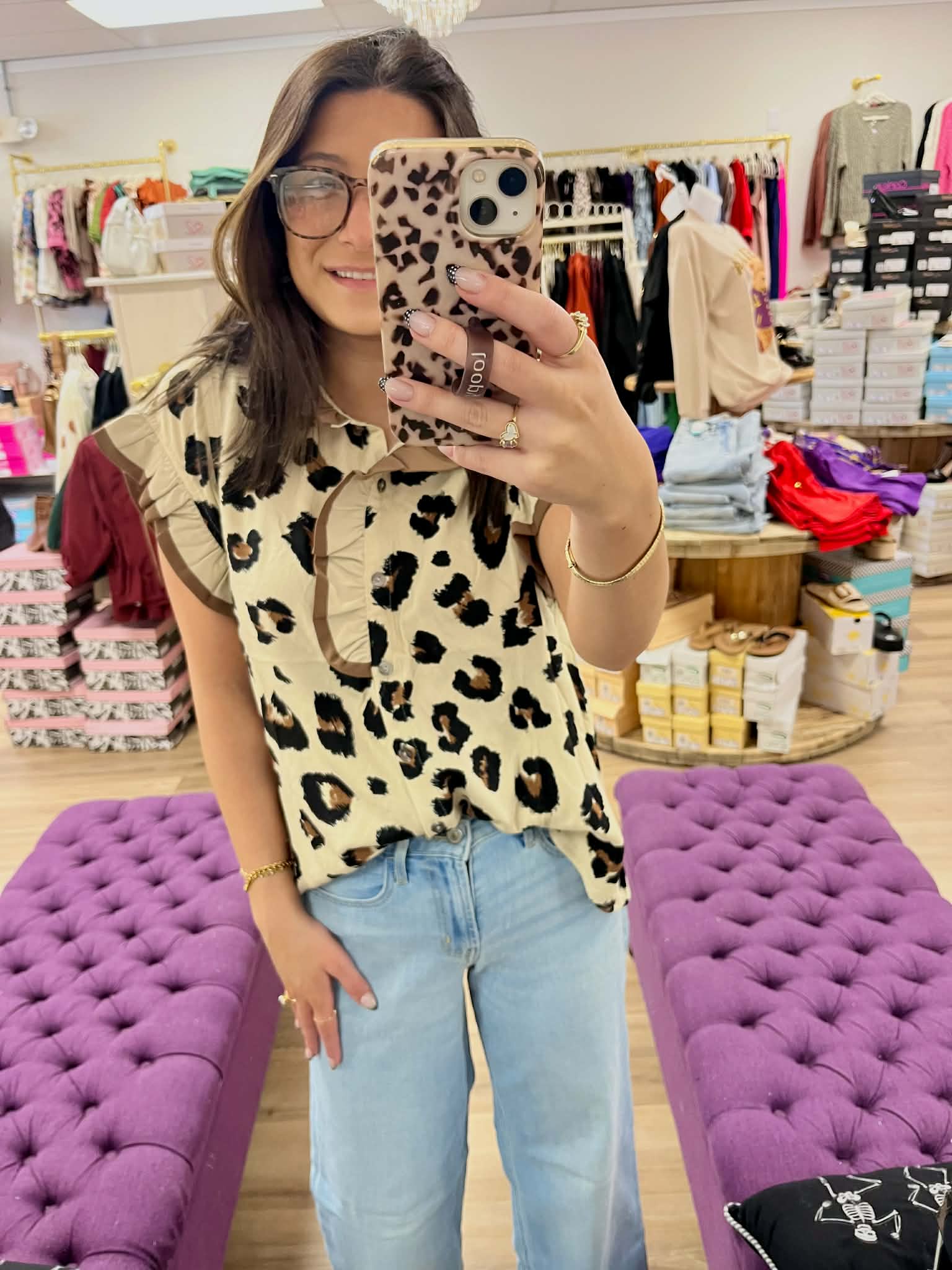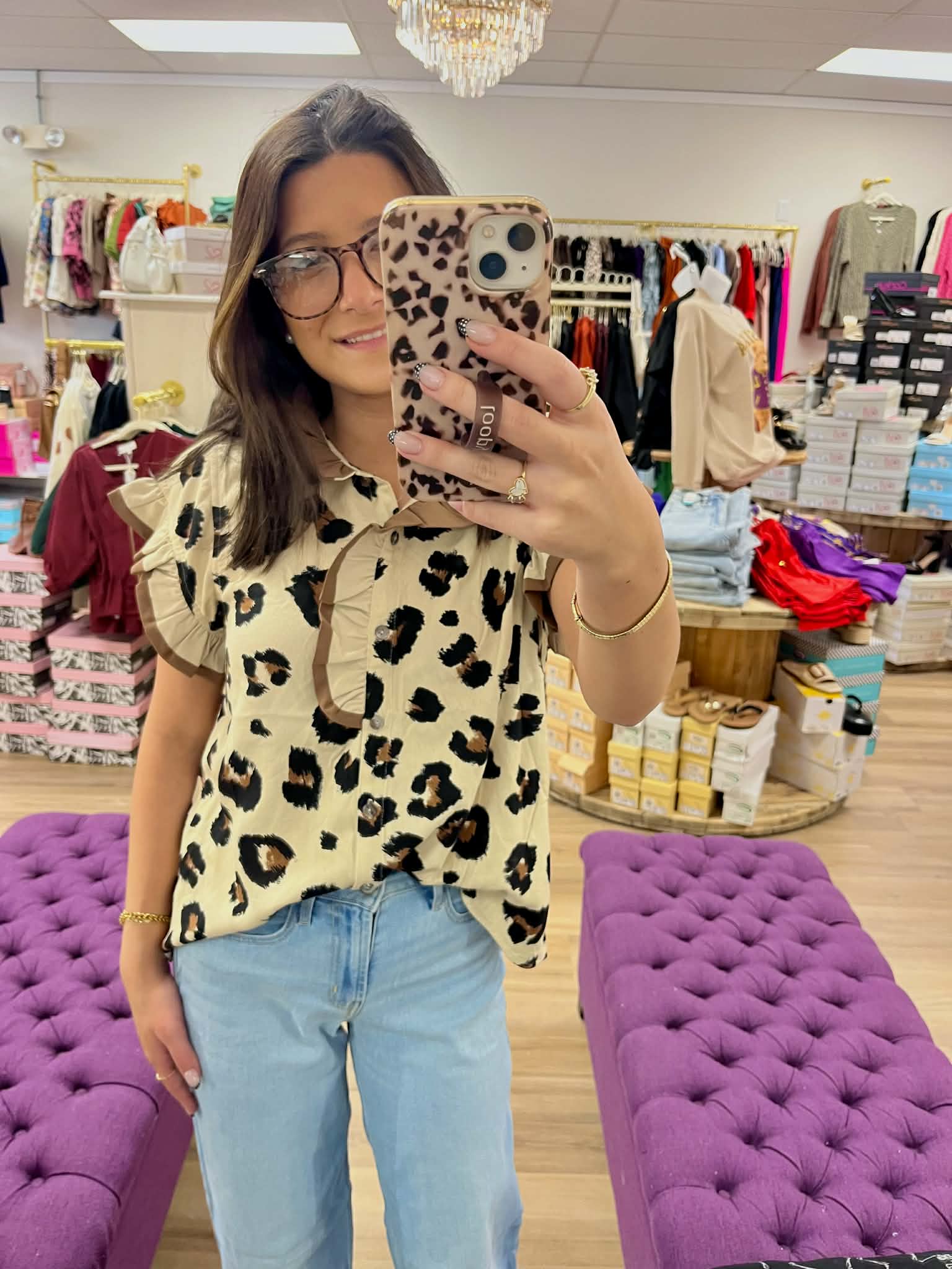 Turn heads with this bold and feminine leopard print button-front top. Designed with playful contrast ruffle detailing along the neckline and sleeves, it perfectly blends fierce energy with a flirty twist. The lightweight woven fabric makes it breezy and comfortable — ideal for dressing up or down from work to weekend.